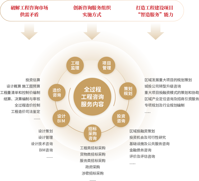 圍繞投資決策綜合性咨詢和工程建設全過程咨詢,整合集成各專業咨詢,力求服務的一體化;倡導按照“1+N+X”模式開展全過程工程咨詢服務,實現各階段咨詢業務在全過程的耦合聯動;根據集團的業務特點和比較優勢,提出了“以項目管理為主線、以投資管控為核心、以過程控制為手段”的全咨理念。